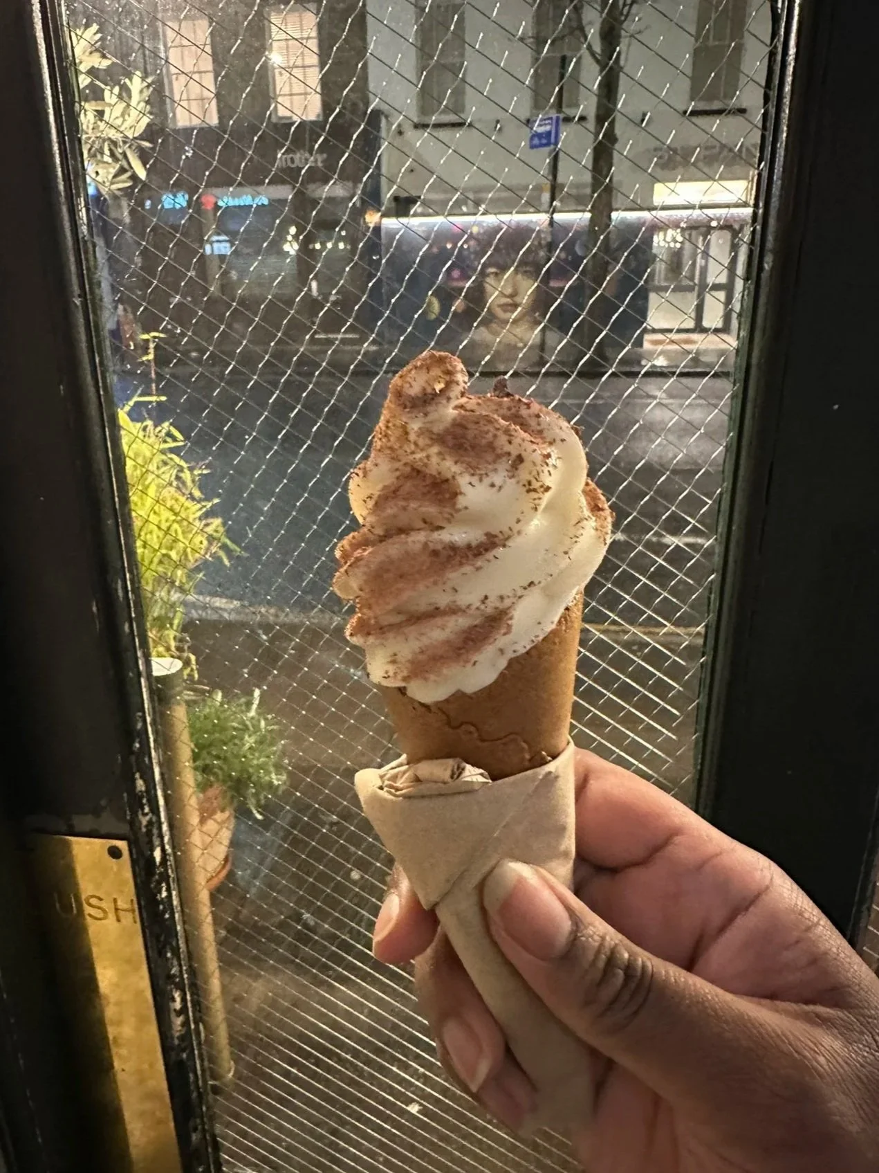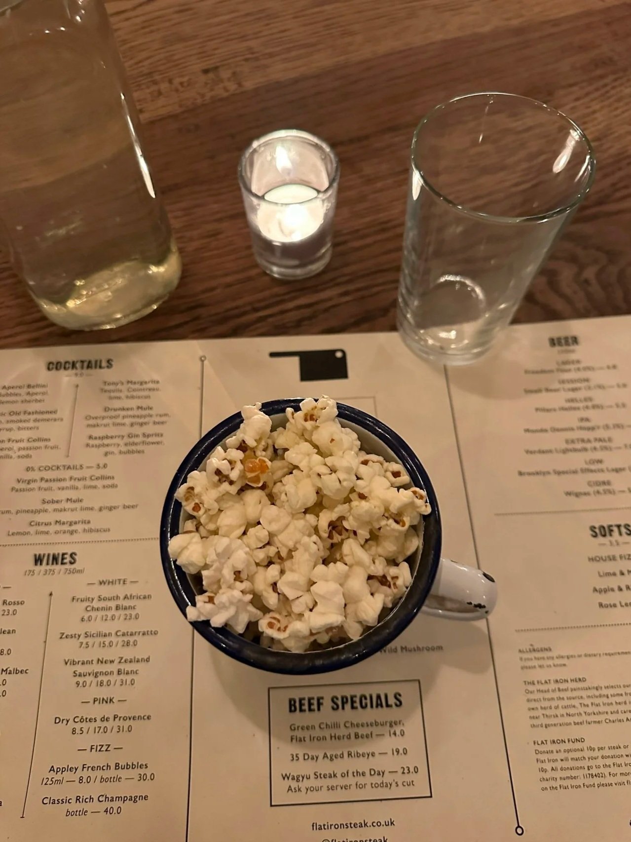 I made dinner reservations the day before at Flat Iron. Flat Iron is a steakhouse with multiple locations throughout the city. The TikTok girlies were comparing it to Applebees… the two restaurants are nothing alike. Flat Iron King Cross location feels like an industrial restaurant in a hip part of town. Flat Iron starts you off with a cup of freshly popped popcorn instead of a bread basket. Their menu is rather limited, with the highlighted item being a flat iron steak, which I presume to be an 8 oz serving, and 3 beef specials of a cheeseburger, daily wagyu special, and Scottish Bavette which is a flank or sirloin cut of steak. There are more sides than meat entrees, and if you are a vegetarian or vegan, Flat Iron may not be for you. I ordered the creamed spinace and bone marrow mashed potatoes which were absolutely amazing! Another meal I would return to London for. Both side dishes were decadent, specifically the mashed potatoes that were topped with crispy garlic and bone marrow oil. Truffle mac and cheese, eggplant, green side salad, and French fries are the side dishes that are available. Once you’re finished your meal, the server will give you a mini cleaver with the bill and you can redeem the cleaver for a free soft-serve cone of Tahitian vanilla ice cream.