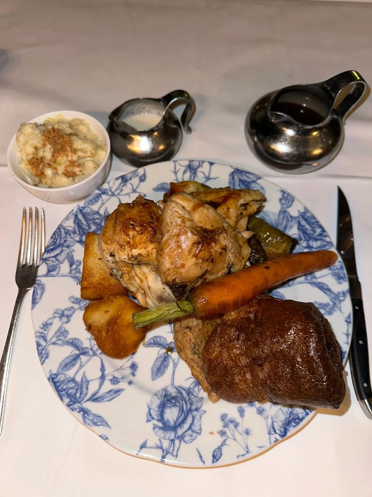 The second reservation I made was for No. Fifty Cheyne in the Chelsea neighborhood for Sunday roast. Sunday roast traditionally is a hearty meat-forward meal eaten on Sundays in London after church, similar to soul food Sundays in the Southern United States. Sunday roast consists of a roasted meat (lamb, beef, chicken, or pork), with roasted potatoes, gravy, Yorkshire pudding (a baked savory custard), and steamed or roasted vegetables. Sunday roast is often cooked at home, or in pubs. No. Fifty is a fabulous restaurant that serves a great roast on Saturdays and Sundays. Another TikTok recommendation that did not let me down. The service here was perfect. Their Sunday roast offers chicken, leg of lamb, beef, or cauliflower steaks for vegetarians. I ordered the chicken roast which came with a bread sauce, roasted vegetables of cabbage and carrots, Yorkshire pudding, and roasted potatoes that were seasoned and flavorful because they are fried in beef fat. The meal was delicious, and every item was flavorful! Why hadn’t I experienced this level of dining the first time I visited London?