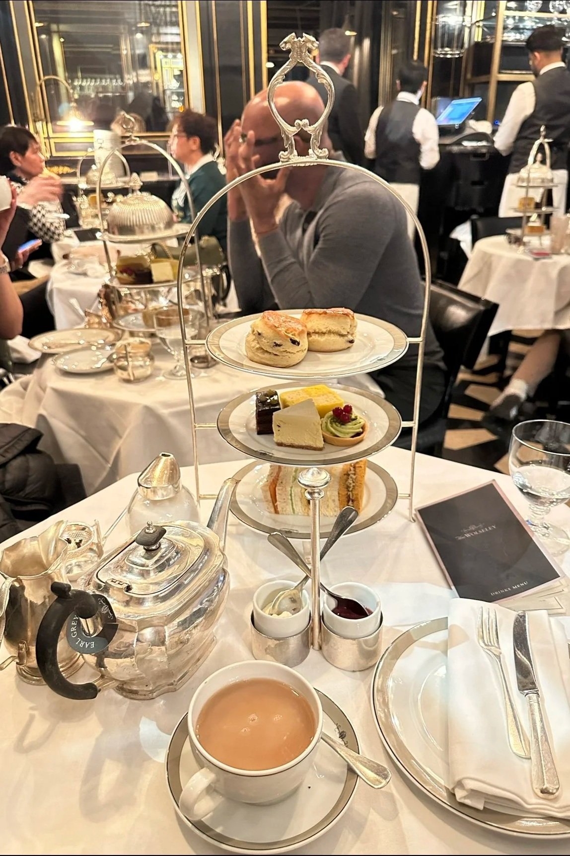After I finished the paella, I had a 4:30 pm reservation at The Wolseley for afternoon tea in Mayfair, near Picadilly Circus. This was one of the two reservations I made in advance before I landed in London. During my first trip to London, the group happened upon The Wolseley and we were able to be seated for afternoon tea as walk-ins. I wanted to relive that nostalgia at The Wolseley of remembering the great time I previously had in London while also consuming English classics. The Wolseley is very classic and semi high-class in my opinion. You don’t need to dress formally to enter, but most people dining here aren’t wearing jeans and tennis shoes: think European casual, not American casual. I arrived at the restaurant 45 minutes before my reservation and had to wait at the bar for a while. Once seated, I ordered the afternoon tea service, which includes one pot of your choice of tea with assorted cakes, scones with clotted cream and jam as well as finger sandwiches, all served on sterling silver and china. The finger sandwiches were cucumber, egg salad, smoked salmon, chicken salad, and cheddar cheese with raisin crustless finger sandwiches. The pastries included a cheesecake, pineapple and lemon cake with a fondant icing, chocolate fudge cake and a raspberry jam tart topped with pistachio icing. The two scones had raisins, I believe. The sandwiches weren’t my speed besides the egg salad and chicken salad, and the cakes were sweet and tasty, but I usually need a savory option to offset the sugar. Because I didn’t enjoy and eat all of the sandwiches, there was nothing to cut the sugar. Moving forward, I would probably only order tea with scones. Tea service may be better at other restaurants, but overall, I found the offerings not my speed. The cheesecake was my favorite, followed by the scones. I’d rank my favorite sandwiches as egg at the top, chicken salad, then cucumber. The salmon and cheese with onion were tied for my least favorite. Many groups and couples were in the restaurant for over 2 hours talking and dining, which is what afternoon tea is all about. Once I finished afternoon tea, I headed back to my hotel to call it a night.